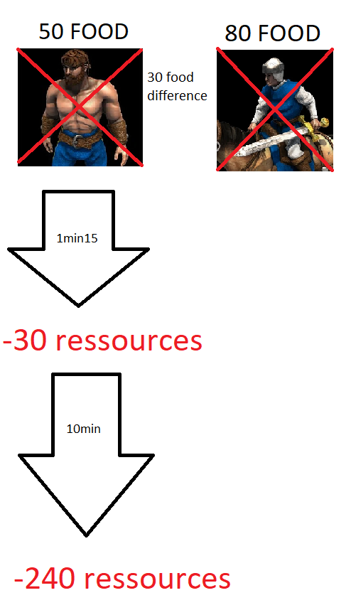 Now, let’s talk again about the economy and why villagers are so important. Consider that your villager collects 10 resources in 25 seconds, which is almost accurate. A scout costs 80 food, and a villager costs 50 food. So, you might think losing your scout to kill a villager isn’t worth it, right? If you think that, you’re wrong. Let’s do some math: The scout costs 30 more resources than a villager, but it takes only 1 minute and 15 seconds for that villager to collect 30 resources. This means that in just 1 minute and 15 seconds, the investment in killing the villager will be worth it. Here’s a graphic to help you visualize it better!